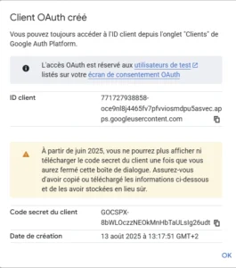 Vous avez terminé ! Vous devez avoir noté en cours de route votre identifiant et mot de passe. Sinon, bien qu’annoncé comme plus disponible à partir de juin 2025, vous pouvez les retrouver dans l’onglet Client :